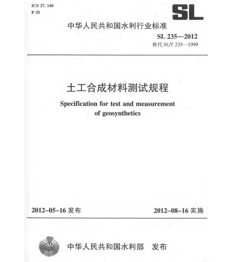 标准简介:根据水利部水利行业标准制(修)订计划, 本标准按照《水 利水电技术标准编写规定》 CSL 1-2002) 的要求, 对《土工合成材料测试 规程》 CSL/T 235一1999) 进行修订。 本标准共 35 章、 1 个附录, 主要包括 32 个测试方法的基本规定、 主要技术内容以及所有测试记录表格式等。